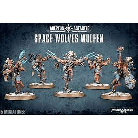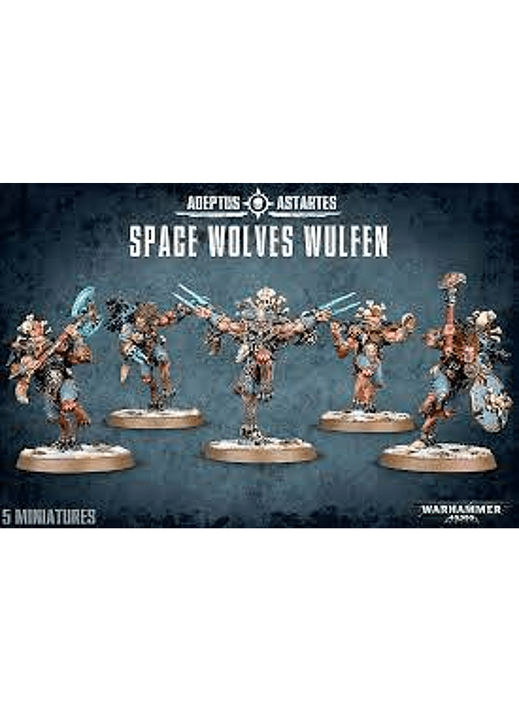 This multi-part plastic kit contains all the components necessary to assemble five Wulfen. These savage beasts can be built with a thunderhammer and storm shield, great frost axe or a pair of frost claws - their backpacks can optionally feature either a grisly trophy rack full of bones or a stormfrag auto launcher. One Wulfen can be assembled as a Pack Leader in a unique pose, with special frost claws, and the box includes numerous decorative pieces to give your Wulfen a unique look.