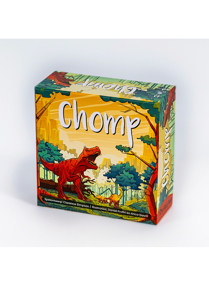 Chomp is een tegellegspel voor 1-4 spelers vanaf 8 jaar. In Chomp creëer je je eigen dinosauruslandschap door tegels te plaatsen en kuddes te vormen. Elke beurt kies je een doeltegel of een landtegel om toe te voegen aan je gebied. Herbivoren en carnivoren hebben beide voedsel nodig, maar pas op: als carnivoren honger hebben, kunnen ze besluiten een herbivoor op te eten! Met slechts acht beurten per spel is het cruciaal om je strategie zorgvuldig te plannen en je kuddes goed te voeden. Snel en spannend – Chomp biedt telkens weer een unieke uitdaging! Chomp ontving 'The Seal of Excellence' van het toonaangevende The Dice Tower!