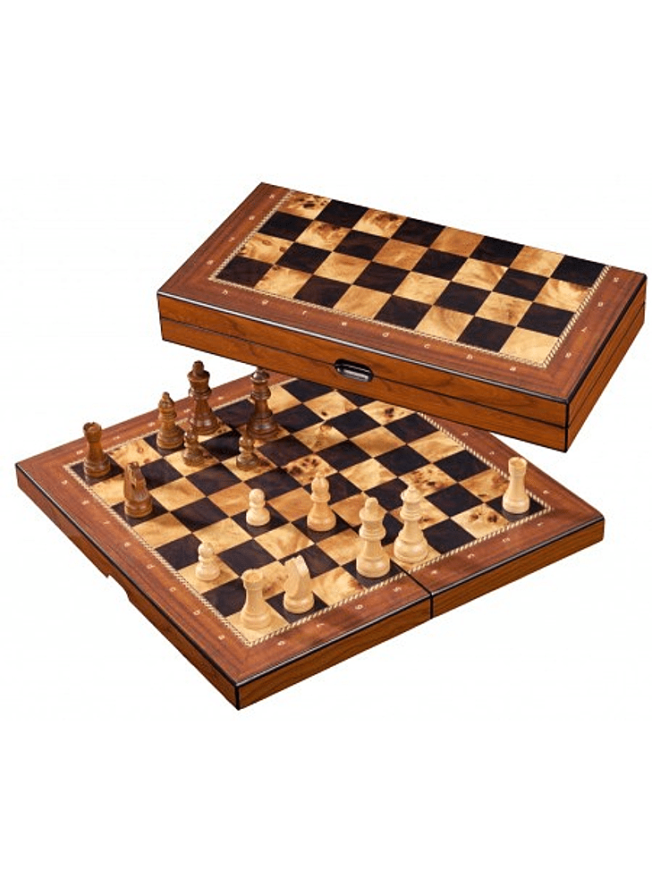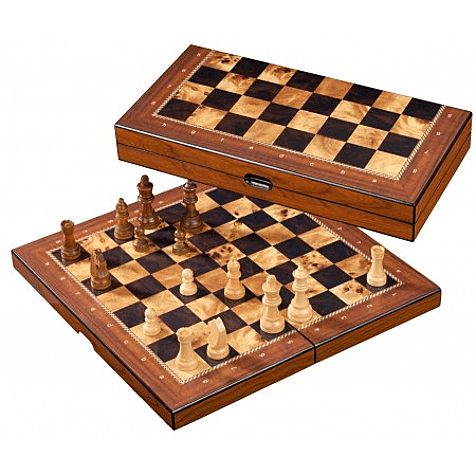Schaak kassette, MDF houten met schima houten stukken in Staunton design, verzwaard met viltsokkel. 40 mm veld, 76 mm Koningshoogte, 400 x 200 x 60 mm.