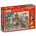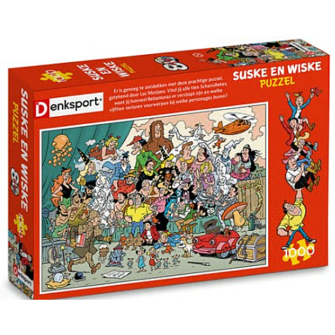Denksport – De Suske en Wiske Puzzel – 1000 stukjes Een vrolijke verzameling personages uit de Suske en Wiske-reeks is bijeengebracht voor deze puzzel. Getekend door Luc Morjaeu en met wel duizend stukjes heb je gegarandeerd uren puzzelplezier. Met een Denksport-puzzel ben je na het leggen van de puzzel nog niet helemaal klaar. Er zijn namelijk allerlei puzzelelementen in de tekening verstopt. Vind jij de: • Tien verstopte Schanullekes • Dertig verdwaalde Bebamoras • Vijftien verloren voorwerpen.