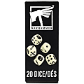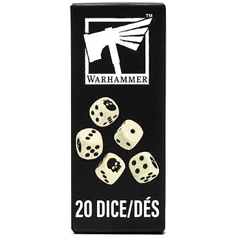 This is a set of 20 six-sided dice with rounded edges for use in games of Warhammer 40,000, Warhammer Age of Sigmar, Warhammer: The Horus Heresy, Warhammer: The Old World, and other systems. They are cast in ivory-coloured acrylic plastic with black ink markings, and measure 12mm along each edge. The 1-5 facings are traditionally pipped, and each '6' face is decorated with a grim skull icon.