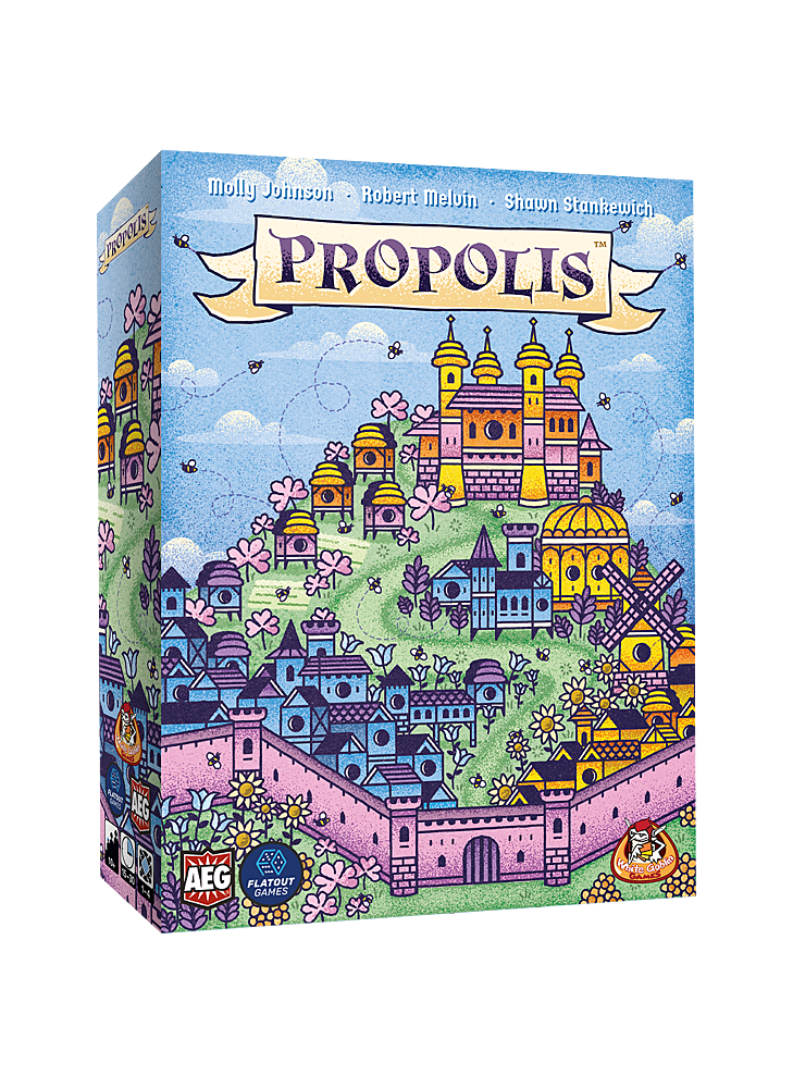 Propolis is een worker placement- en engine building- spel van de makers van Calico, Cascadia en Point Salad! Je bent de leider van een middeleeuwse bijenkolonie en zet werkbijen uit om stuifmeel en propolis te verzamelen. Daarnaast versterk je je positie in de bloemrijke omgeving van het rijk en bouw je aan een bijenkorf om je koningin tevreden te stellen en te winnen!