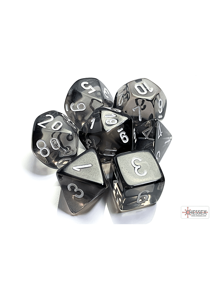 Voor gebruik in tabletop RPG-spellen (zoals Dungeons and Dragons). Deze set bevat 7 doorschijnende rookdobbelstenen met witte cijfers in de volgende vormen: 1 x 4-zijdige dobbelsteen (PT0478), 1 x 6-zijdige dobbelsteen (PT0678), 1 x 8-zijdige dobbelsteen (PT0878), 1 x 10-zijdige dobbelsteen (PT1078), 1 x 10-zijdige dobbelsteen (PT1178), 1 x 12-zijdige dobbelsteen (PT1278), 1 x 20-zijdige dobbelsteen (PT2078).